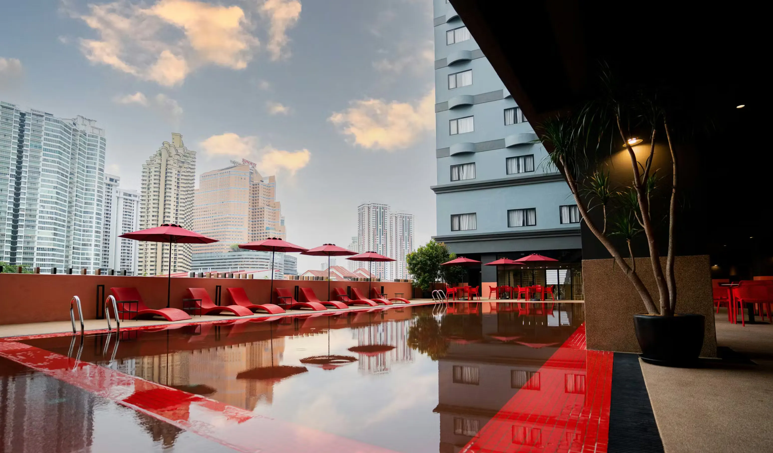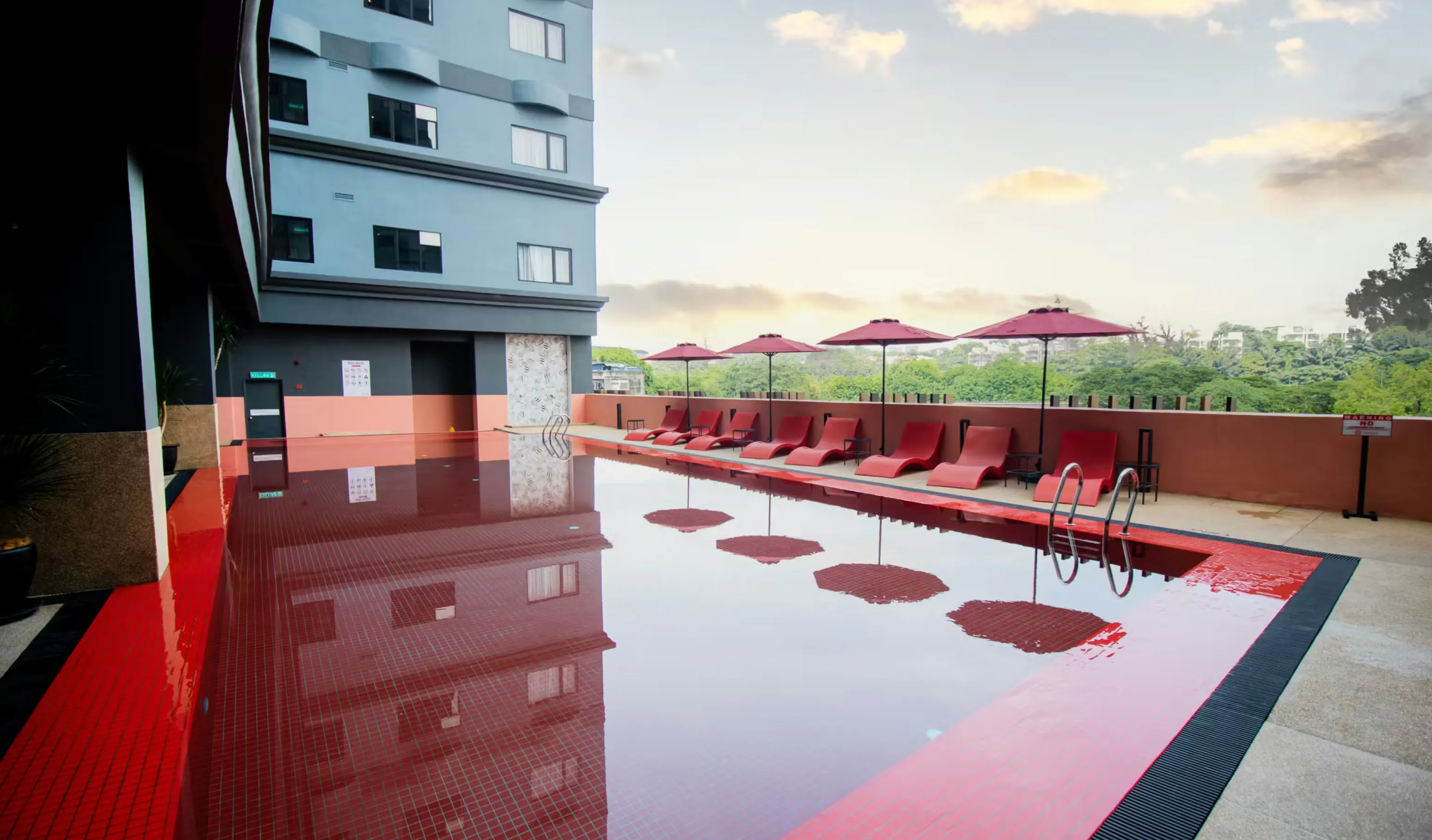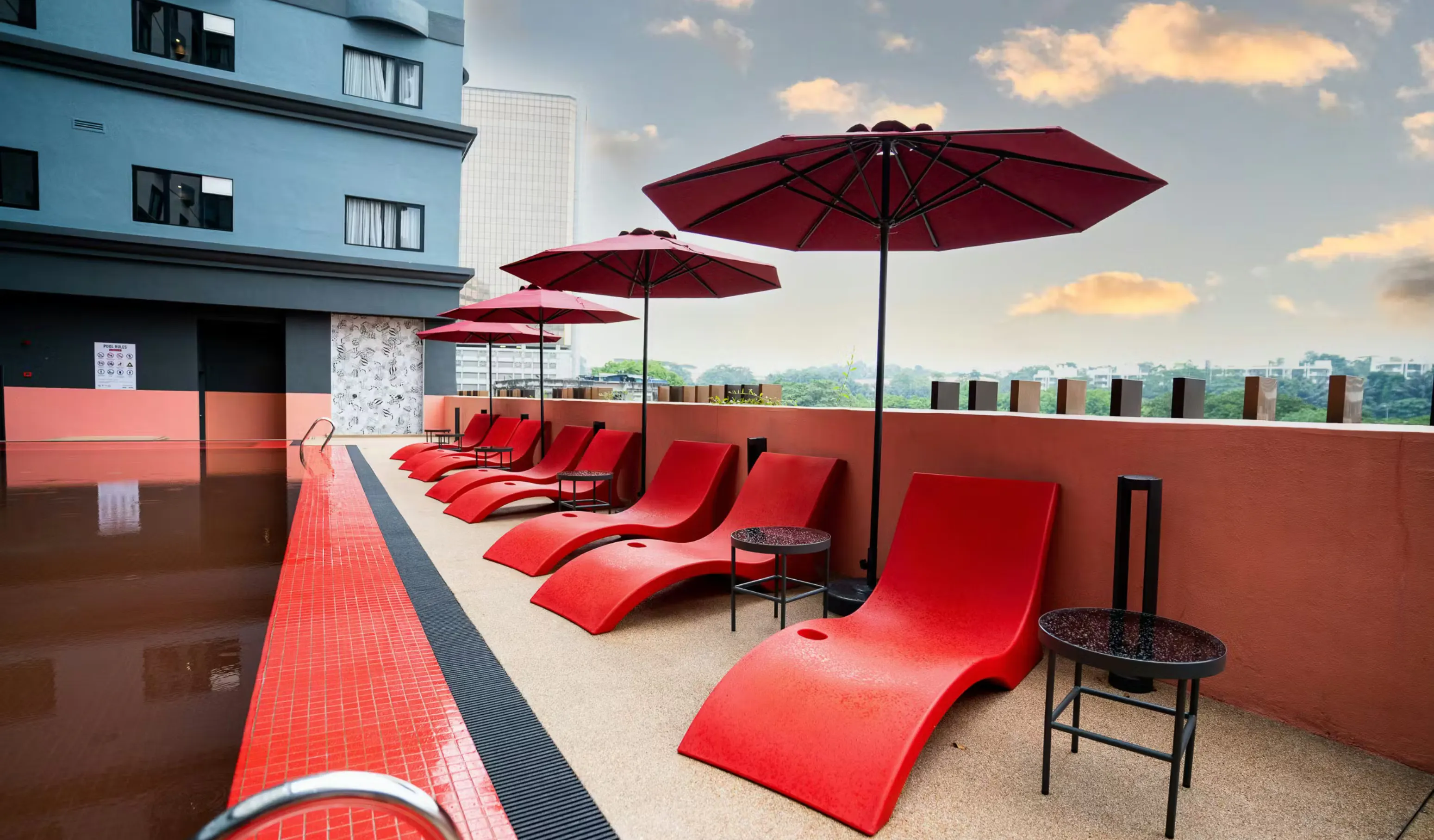 Located at level 2 is the iconic swimming pool which built of mosaic tiles in passionate red. The identity of the pool was endorsed with sun loungers, umbrellas and towels in the same colour palette to highlight its unique, sophisticated and cheerful theme. Guests can relax and unwind by The Red Pool or swim to workout in a quiet and peaceful environment.