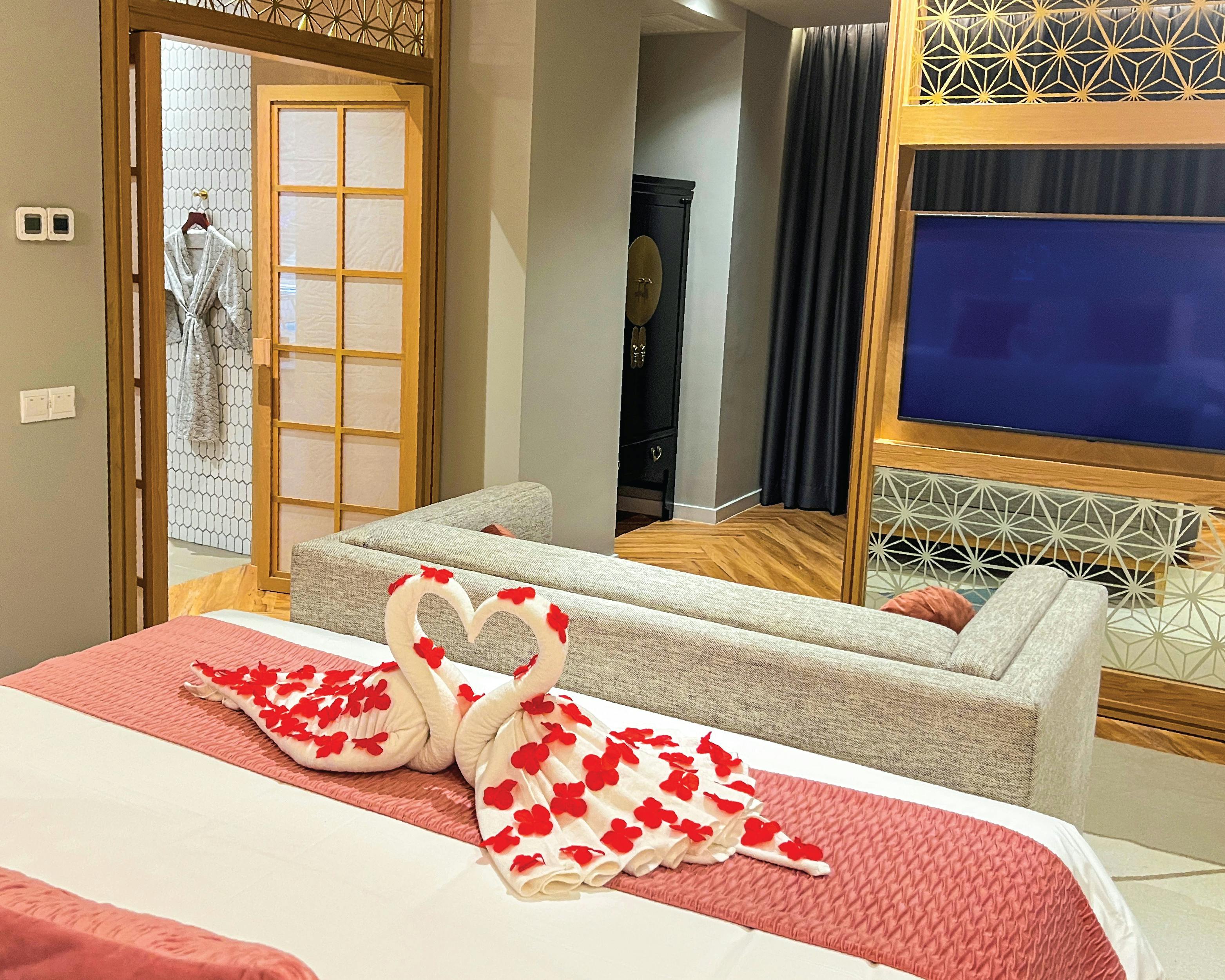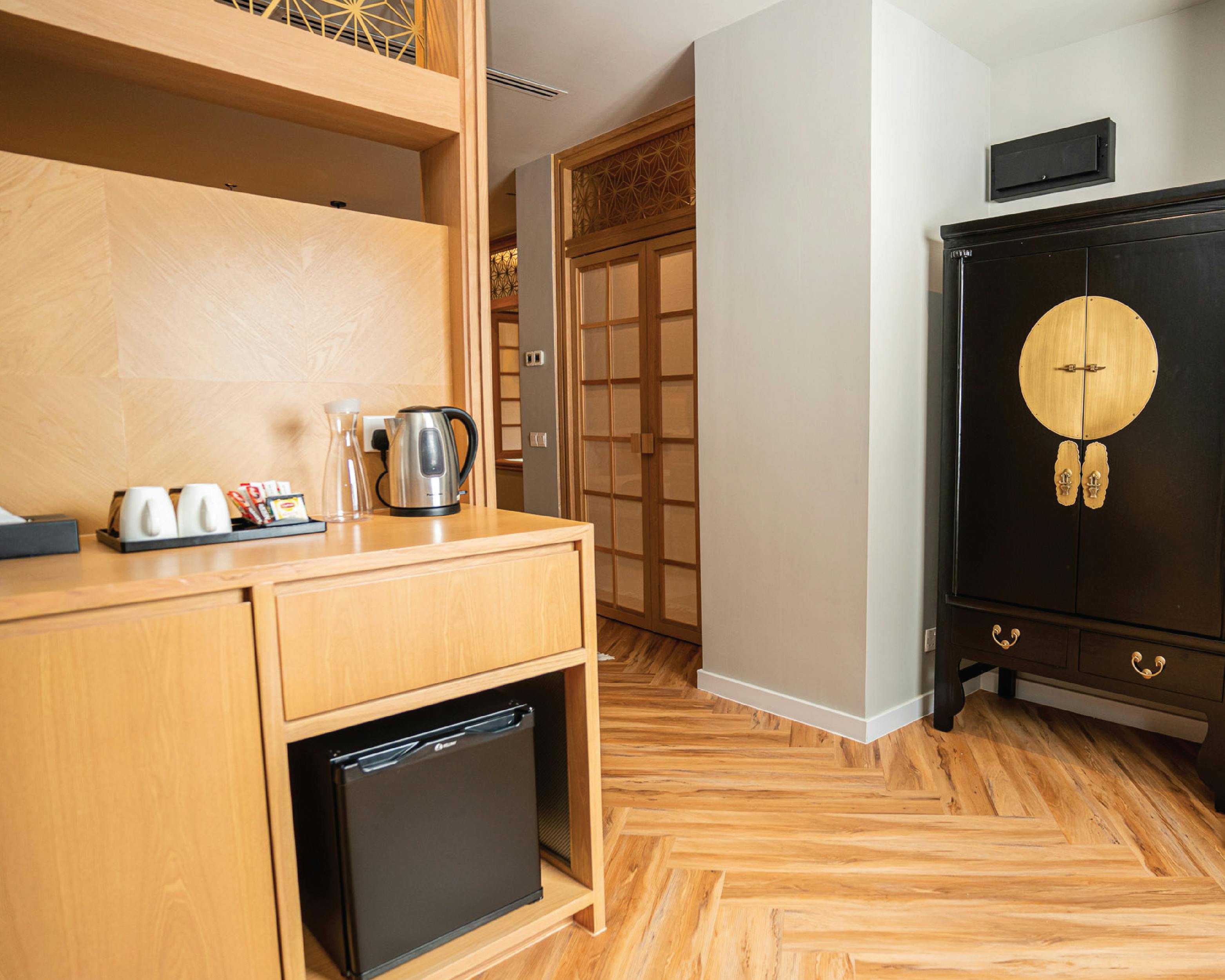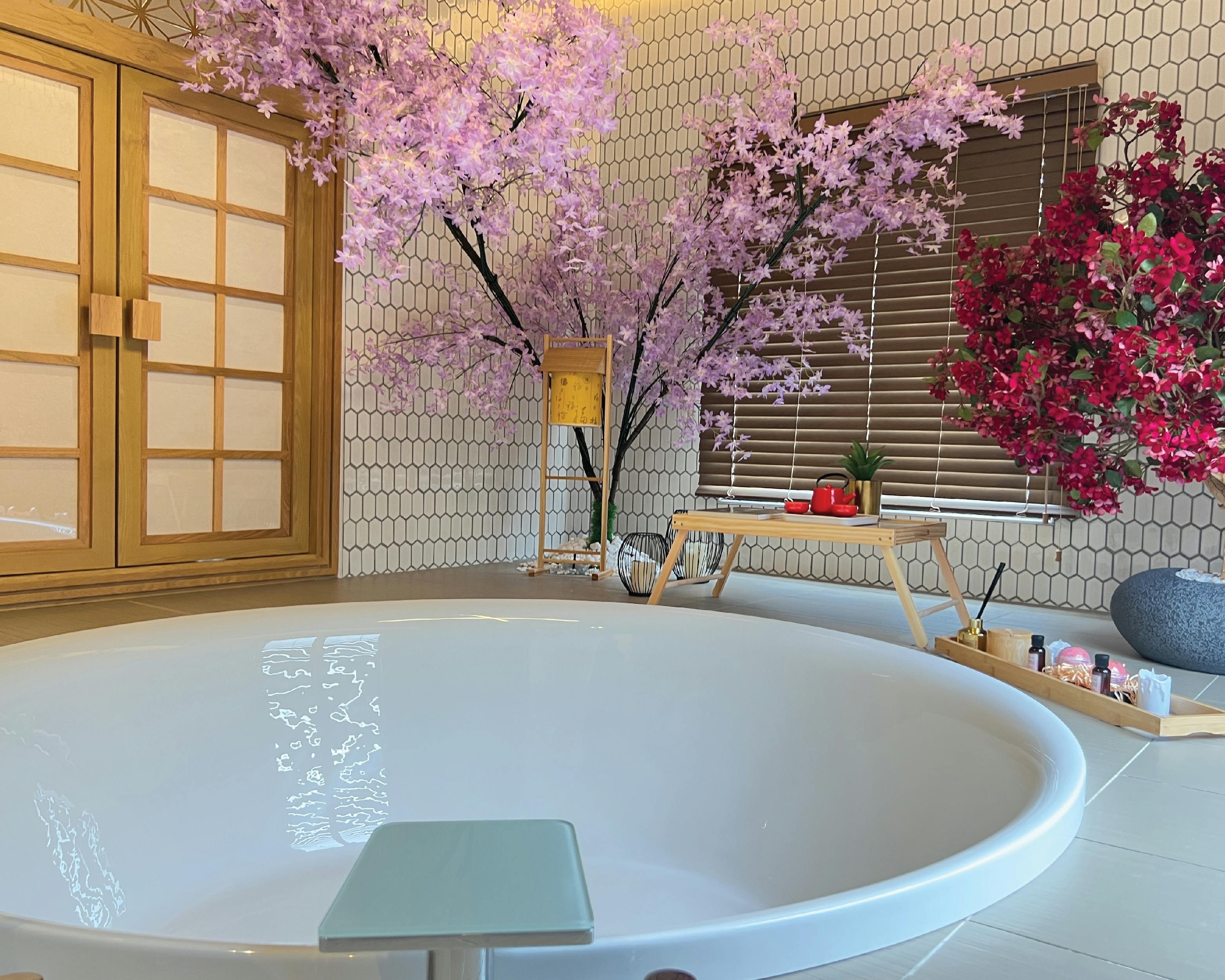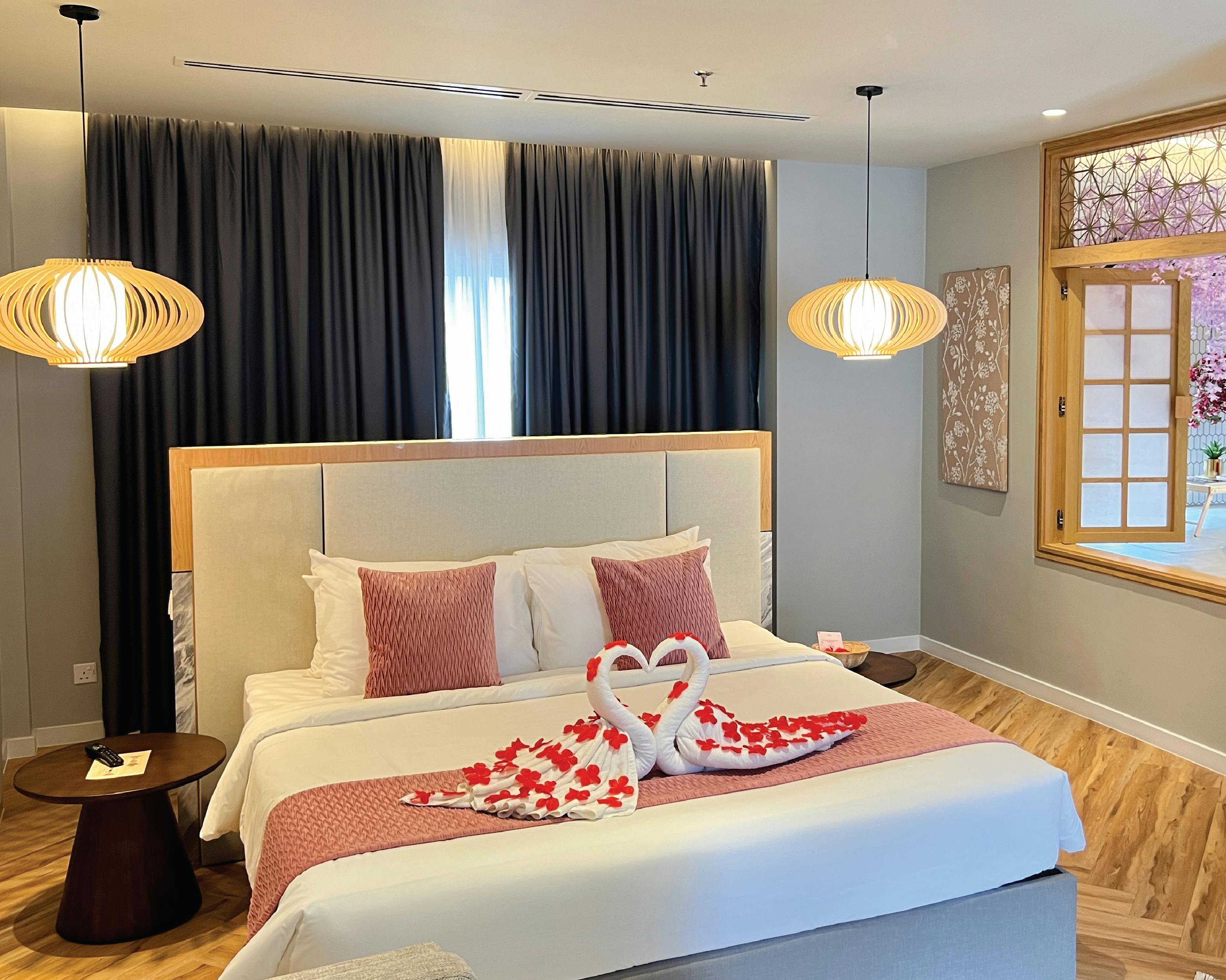 Stepping into the Sakura Suite is as if you had entered another place and time. This specially curated room, Japanese inspired suite houses a King bed, with 10-inch mattresses. Tailor-made for our couples wanting a little loving and alone time. The room has natural light, timber flooring, a powerful rain shower and handheld shower, soft sheets, bespoke amenities, black-out curtains, bedroom slippers, bathrobes, fridge, hairdryer, in-room safe, air conditioning, reusable water bottles, coffee & tea making facility, Smart TV, and The Largest Luxury bathtub in Town.