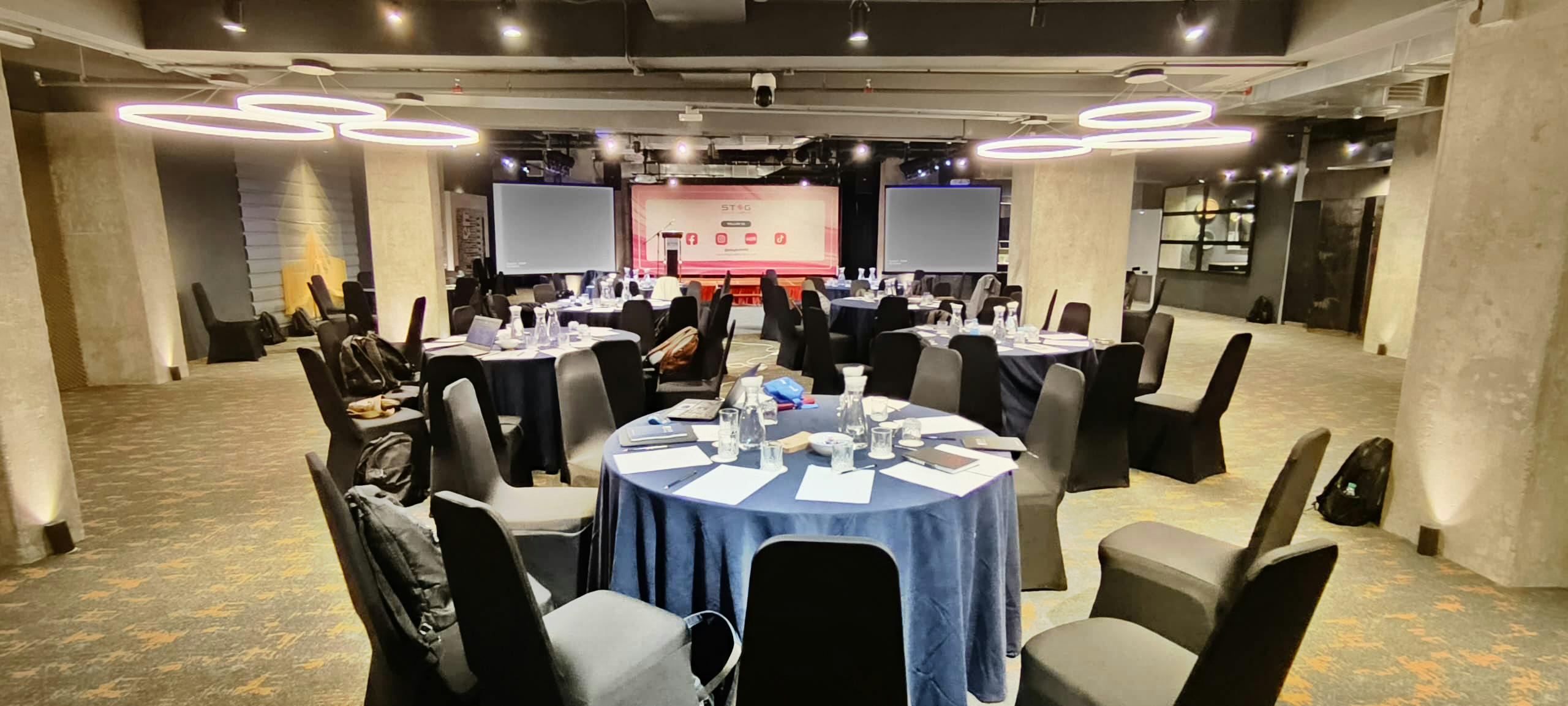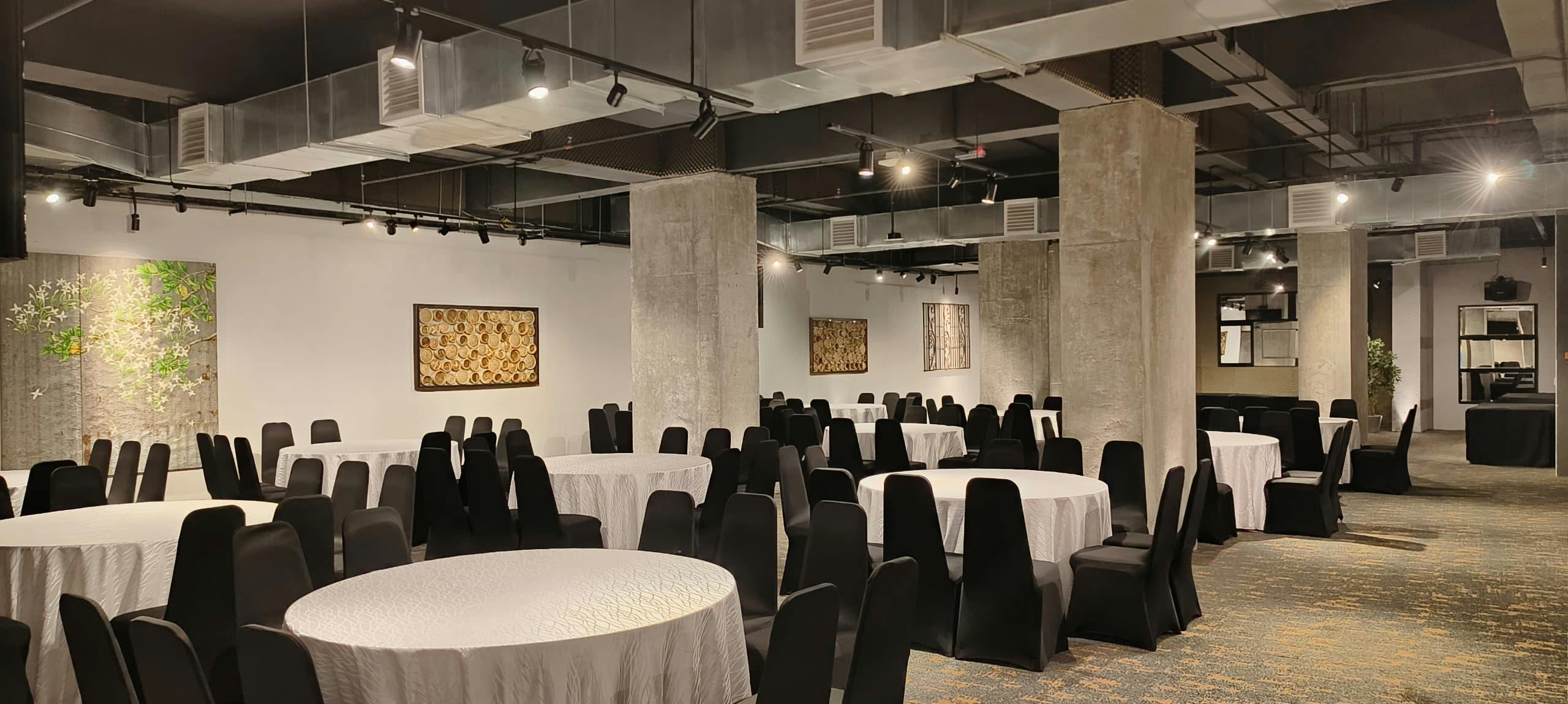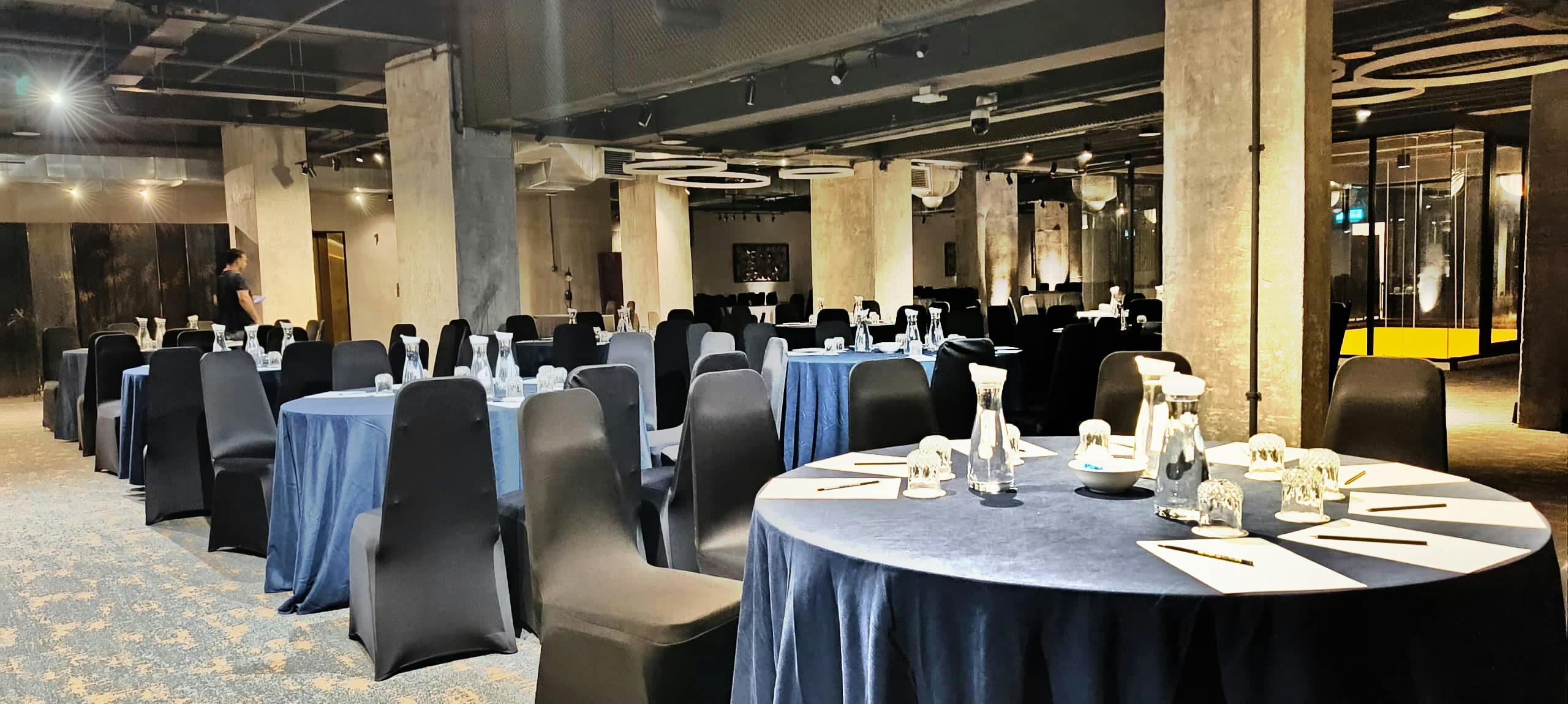 Bankett Hall 整體設計融合現代與質樸元素,灰色混凝土牆面搭配金屬裝飾,營造出沉穩而具層次的視覺風格。空間以當代吊燈與設計感燈飾點綴,展現優雅而不流於傳統的宴會氛圍。