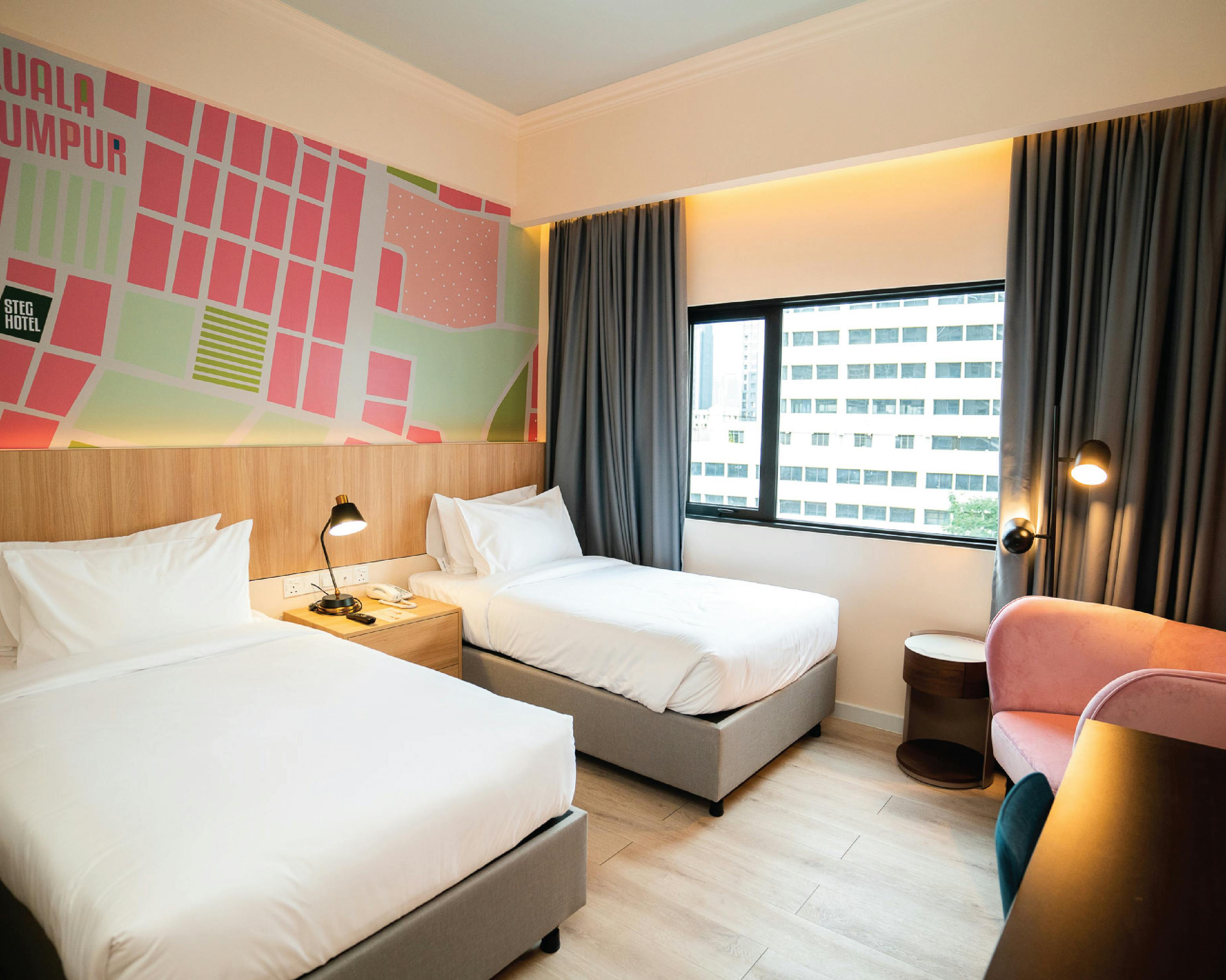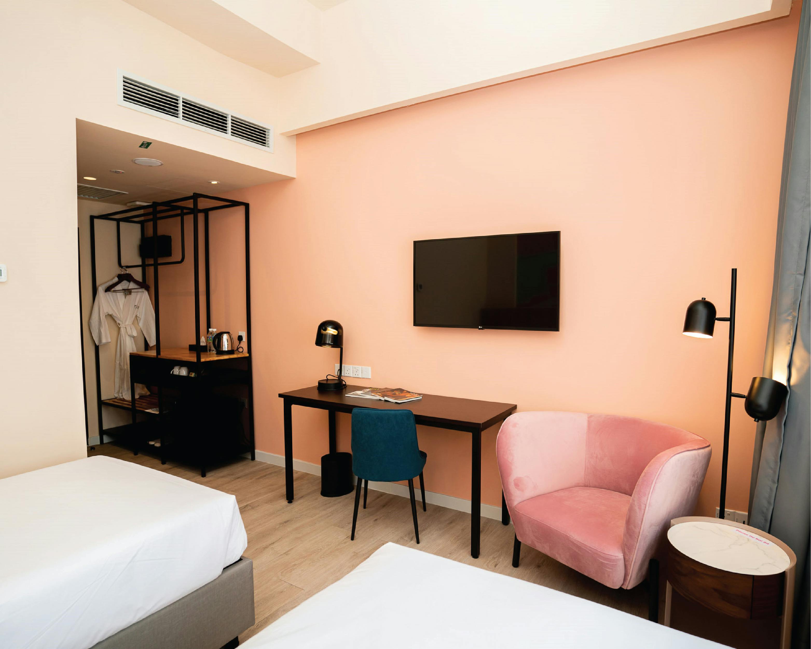 This cosy room houses two super single beds with 10 inch mattresses. All rooms has natural light, timber flooring, powerful rain shower & hand-held shower, luxurious sheets, bespoke amenities, black out curtains, bedroom slippers, fridge, hairdryer, in-room safe, air conditioning, reusable water bottles, coffee & tea making facility and Smart TV. Every room has access to high speed internet with charging stations and USB ports.